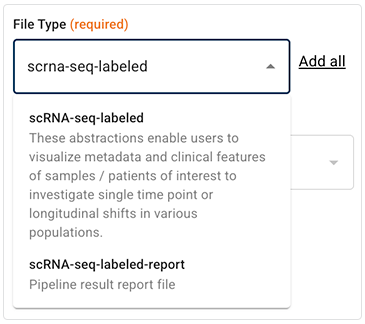 Many file types, such as the scRNA-seq file types shown here, are annotated with general descriptions of the file content or format. If you're not sure which file type you want in your search results, use these descriptions to help you decide.