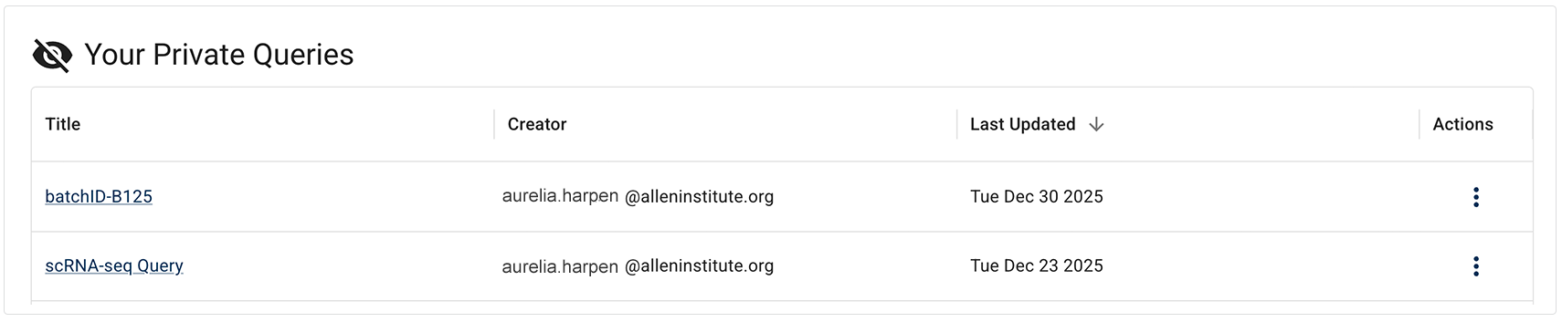 You can begin your search with a saved query in one of two ways. If someone gives you the URL of a saved query, such as http://allenimmunology.org/#/advanced-search/query/*queryId*, paste it directly into a browser to open it. Alternatively, you can open a saved query from the Saved & Shared Queries space. See the instructions following the NOTE box.