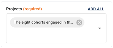 A. In the Projects field, click the arrow to open the drop-down list, and select one or more projects. Alternatively, to select all available projects, click ADD ALL.