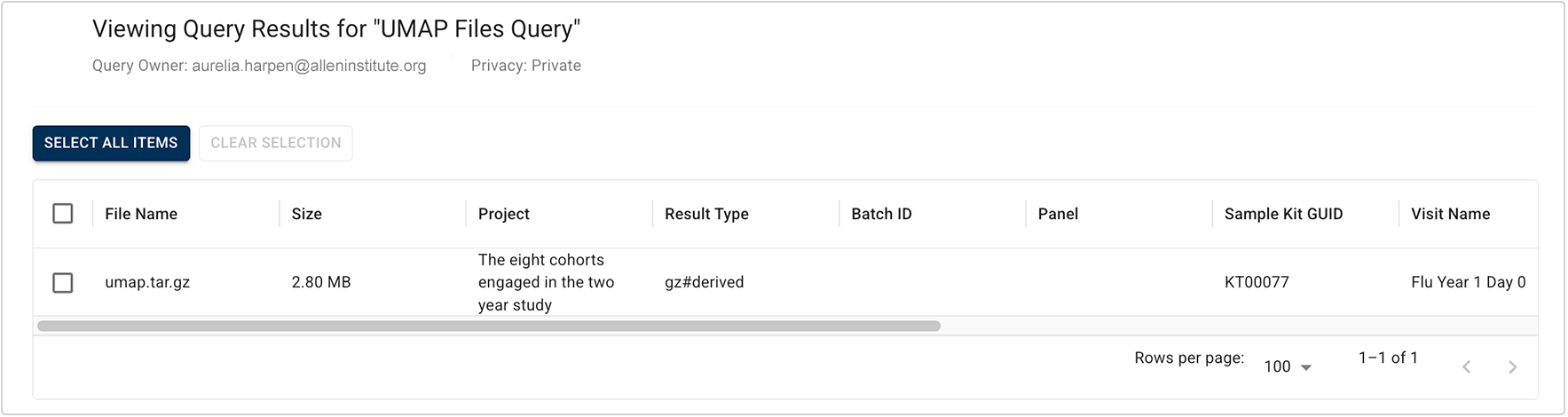 C. When the query opens, proceed directly to the results window. (You don't need to select filters, since filter selections are already baked in to the saved query.) Use the checkboxes to select the items you want to use, as in the example shown here. To select all results, click SELECT ALL ITEMS.