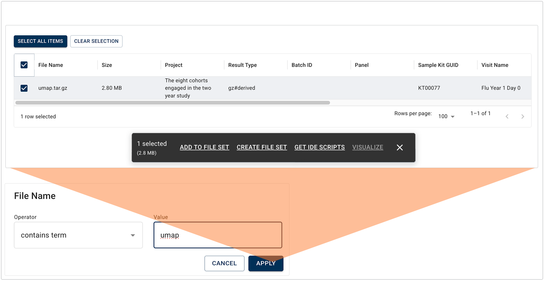 ii. Choose an operator and a value. In this case, as shown in the image below, we chose contains term as the operator and umap as the value. Click APPLY.