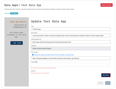 8. Proceed to Step 4 in the next section, Add an author to a Data App. From that point on, the instructions to add an author to a publication or a Data App are identical.