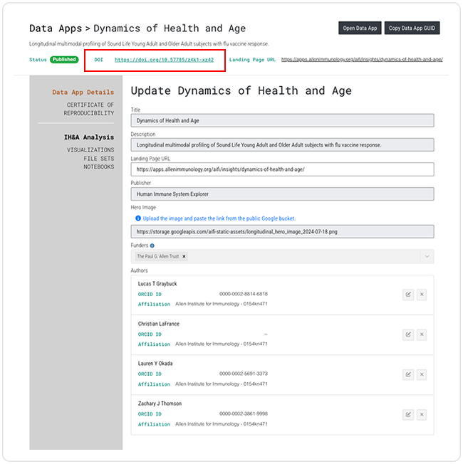 Data Apps use DOI numbers to track document provenance and versioning. These unique identifiers are registered in a central database and include metadata (such as title and author) that helps create a citation recognized throughout the scientific community. The DOI is generated automatically. When your Data App is published, the DOI appears at the top of the Data App Details page, as shown in the accompanying image.