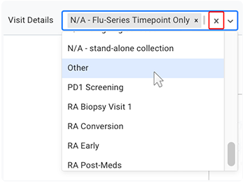 iv. To delete details for a given visit, click the small x to the right of the Visit Details tag.