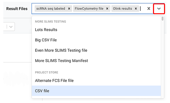 i. Result file types are prepopulated in the Result files field. To display more file types, click the arrow to the right of the Result files field.