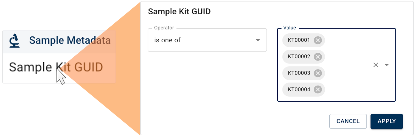 5. Return to the Sample Metadata group in the Advanced Filters section, and choose the Sample Kit GUID filter.