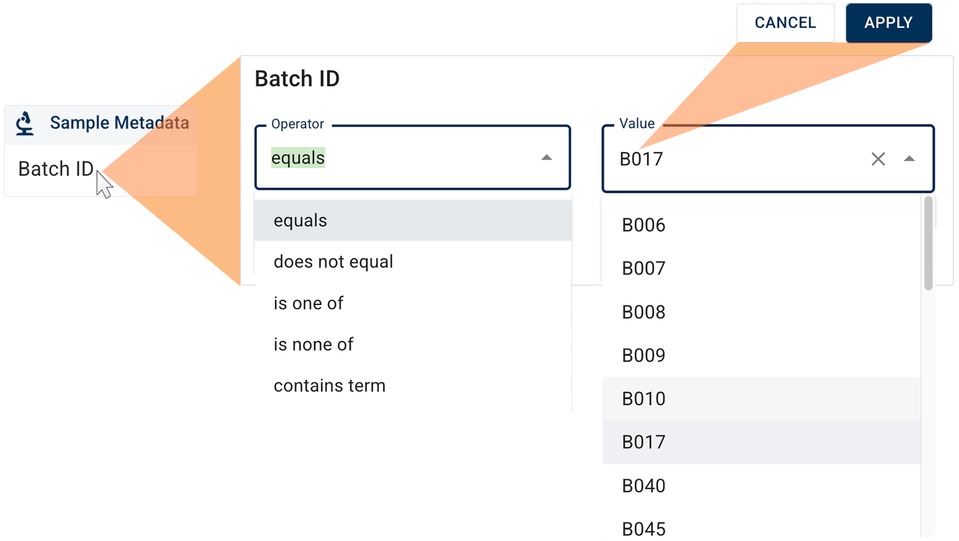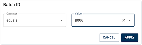 4. In the Batch ID dialog box, choose equals as the operator and B006 as the value, and click APPLY.