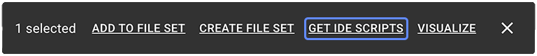 ![]() | GET IDE SCRIPTS | Use this option to generate and download scripts you can run in a supported IDE. Load the selected results as an input dataset for modeling, differential analysis, or QC. For details, see Attach an IDE to a Study (Tutorial). |