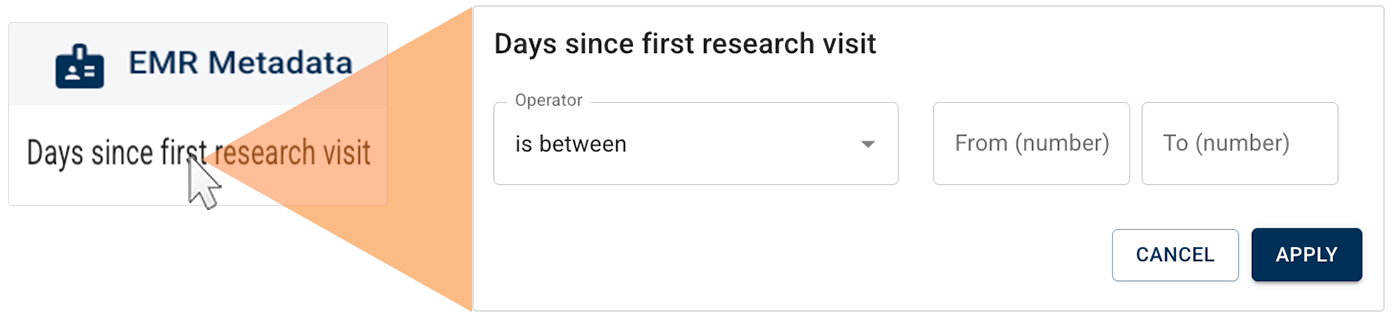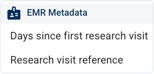 H. EMR Metadata filter group. This group captures various descriptive fields, such as file IDs, dates, and linkage keys, associated with EMR records. Use this filter group to find data based on how or when it was ingested or categorized.