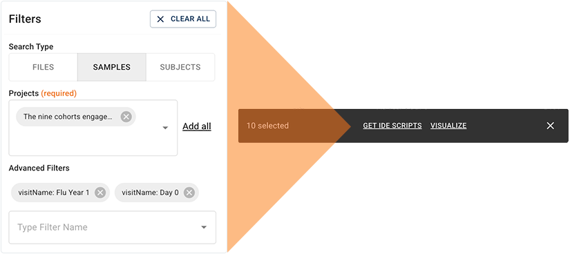 The redesigned HISE Advanced Search lets you use an intuitive, shopping‑style interface to find the data you need for your research. You define the search scope, pick a category (files, samples, EMR, or public files), and apply filters that behave like selections in an online store. As you narrow your results, more granular, context‑specific filters appear to help you refine your data set by attributes such as batch or panel ID, visit, and cohort. Using these filters makes it easy to reproduce an analysis data set, limit results to a particular disease state or visit window, or pull files tied to a known subject, specimen, or file ID. The next section walks through these steps so you can apply them to your own searches.