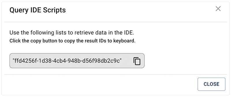 1. In the Query IDE Scripts box, click the copy icon. Use it to load the filtered data set into your IDE environment, where you control the libraries, methods, and outputs.