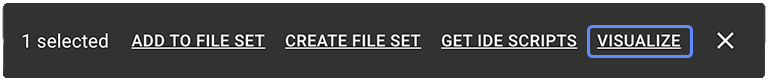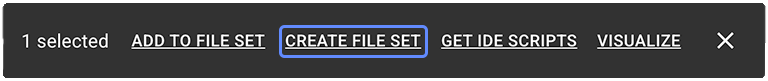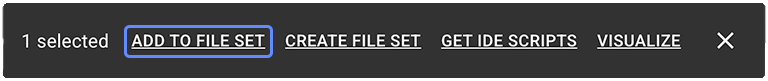 ![]() | ADD TO FILE SET | Use this option to add the selected items to an existing file set that you choose from the Options menu. You can reuse the same collection of files in analyses, visualizations, or Data Apps. For details, see Work with File Sets (Tutorial). |