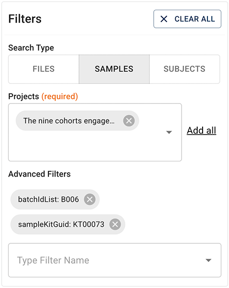 1. In the Filters panel, select SAMPLES as the search type.