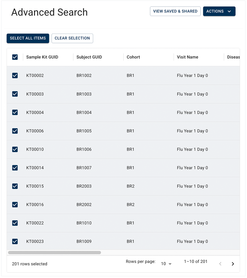 3. In the results window, select the checkbox next to each result you want to include in your data set. To keep all results, click SELECT ALL ITEMS. To see the number of rows selected, check the lower-right corner of the table.