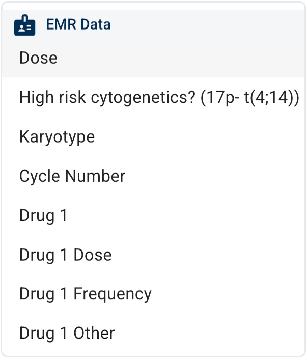 G. EMR Data filter group. This highly variable filter group consists of dynamically generated, structured clinical fields from the EMRs associated with your selected projects. Examples include specific diagnoses, lab values, and treatment attributes. These filters are used to find data associated with specific subjects or samples.