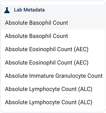 I. Lab Metadata filter group. This group narrows your results based on laboratory measurements and derived lab values, such as absolute basophil, eosinophil, or lymphocyte counts. These filters help you find records for subjects or samples with specific lab profiles or ranges that matter for your analysis.