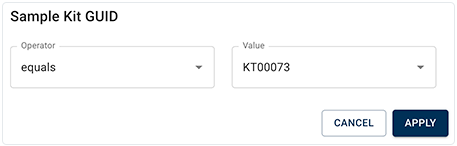 6. In the Sample Kit GUID dialog box, choose equals as the operator and KT00073 as the value, and click APPLY.