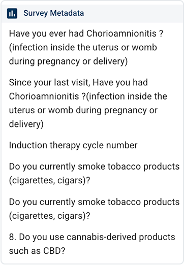 F. Survey Metadata filter group. Selections in the Survey Metadata filter group vary widely. They describe the respondents who participated in a survey and the survey context, such as when and how the data collection occurred and what questions were asked. This filter does not include survey responses.