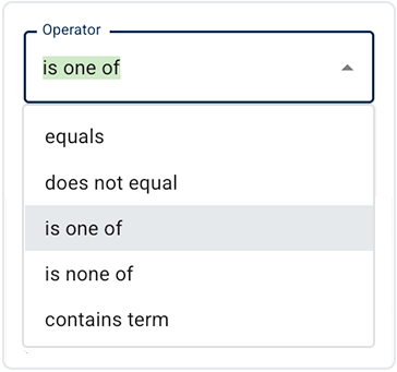 1. After each filter selection, click the arrow to the right of the Operator field and choose an operator from the drop-down list (see the images and the accompanying table). Operators, like filters, are context specific, so the operators available to you depend on the filter you select.