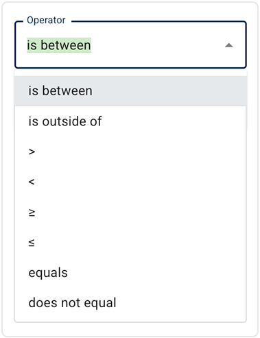 1. After each filter selection, click the arrow to the right of the Operator field and choose an operator from the drop-down list (see the images and the accompanying table). Operators, like filters, are context specific, so the operators available to you depend on the filter you select.