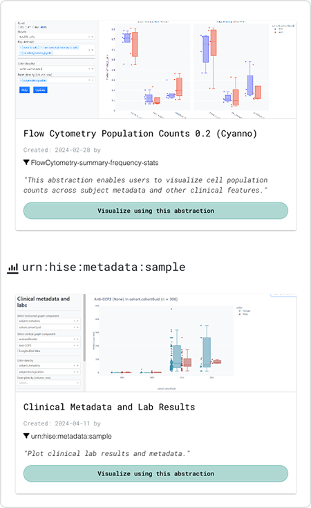 You can use No-Code Visualizations to visualize human metadata or flow cytometry data. In an advanced search, a samples query yields a human metadata visualization. A results files query yields a visualization of the flow cytometry supervised gating pipeline.
