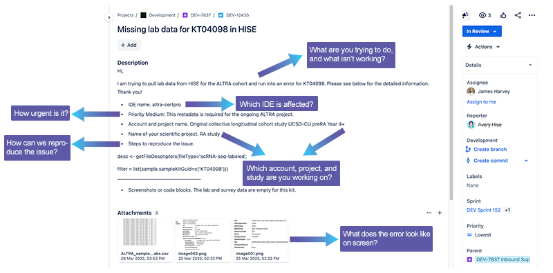 - Screenshots or code blocks. Include the error message, error logs, or other additional information to help your support engineer diagnose and troubleshoot the issue.