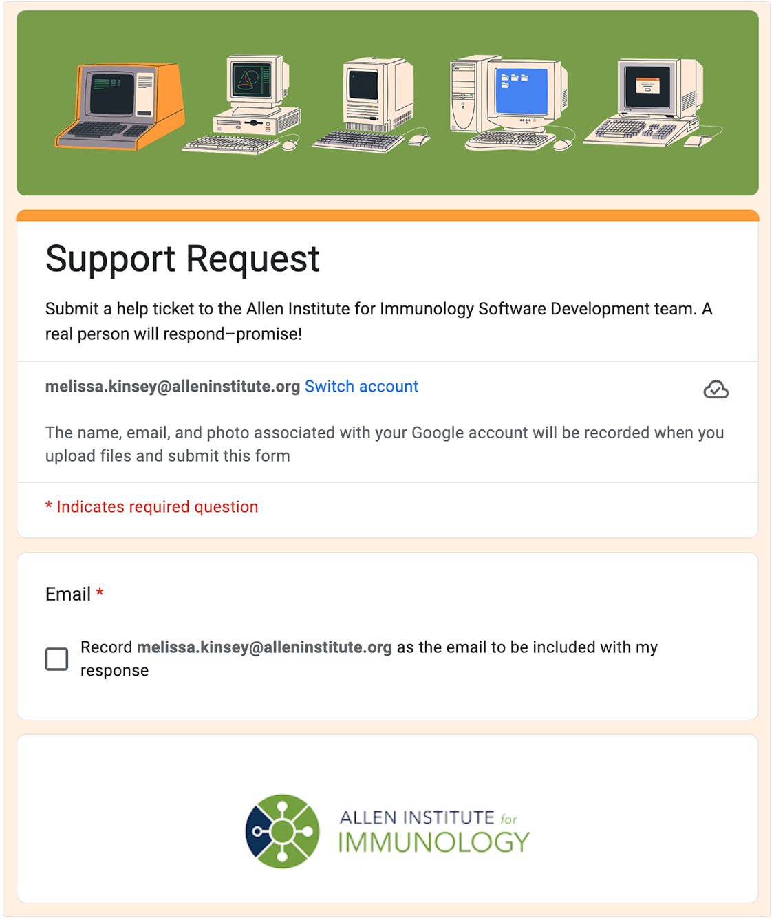 In the upper-right corner of each user documentation page (support.allenimmunology.org), including this one, is a Support button. This button opens a Google Form that automatically populates a Jira ticket and sends it to the entire dev team (immunology-support@alleninstitute.org). One of the developers will reply during normal business hours.
